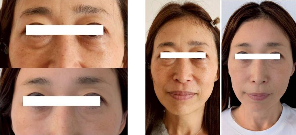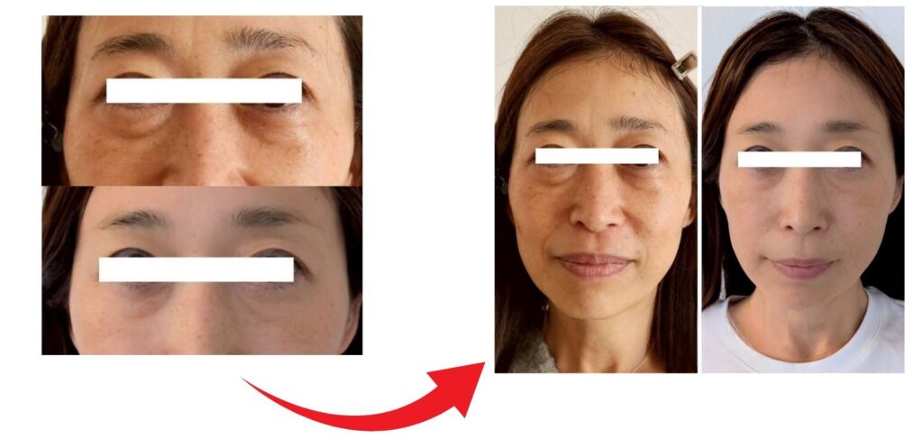 顔全体の施術後1週間程で目の下のたるみやくすみが段々薄くなり始めた。2ヶ月後、お肌のツヤ、目元の張りが出てきて、若々しい印象になりました。