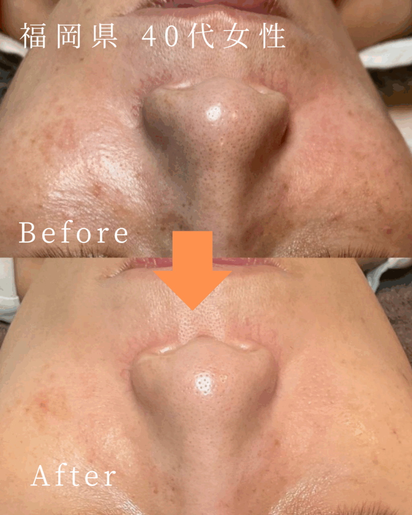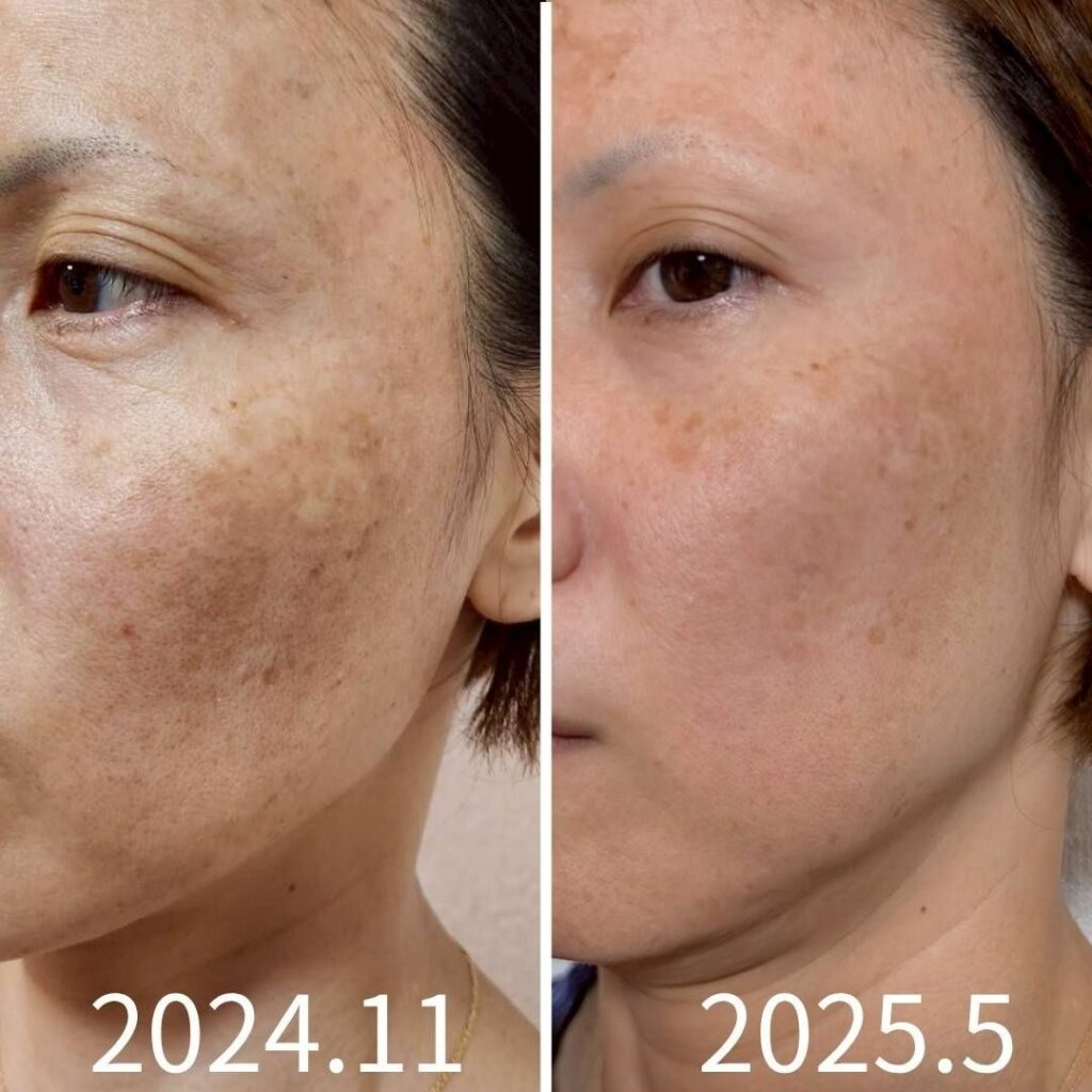 施術後、気になっていたくすみとシミが徐々に薄くなっていった。顔に立体感が出て、肌トーンが明るくなり、より明るい印象になりました。
